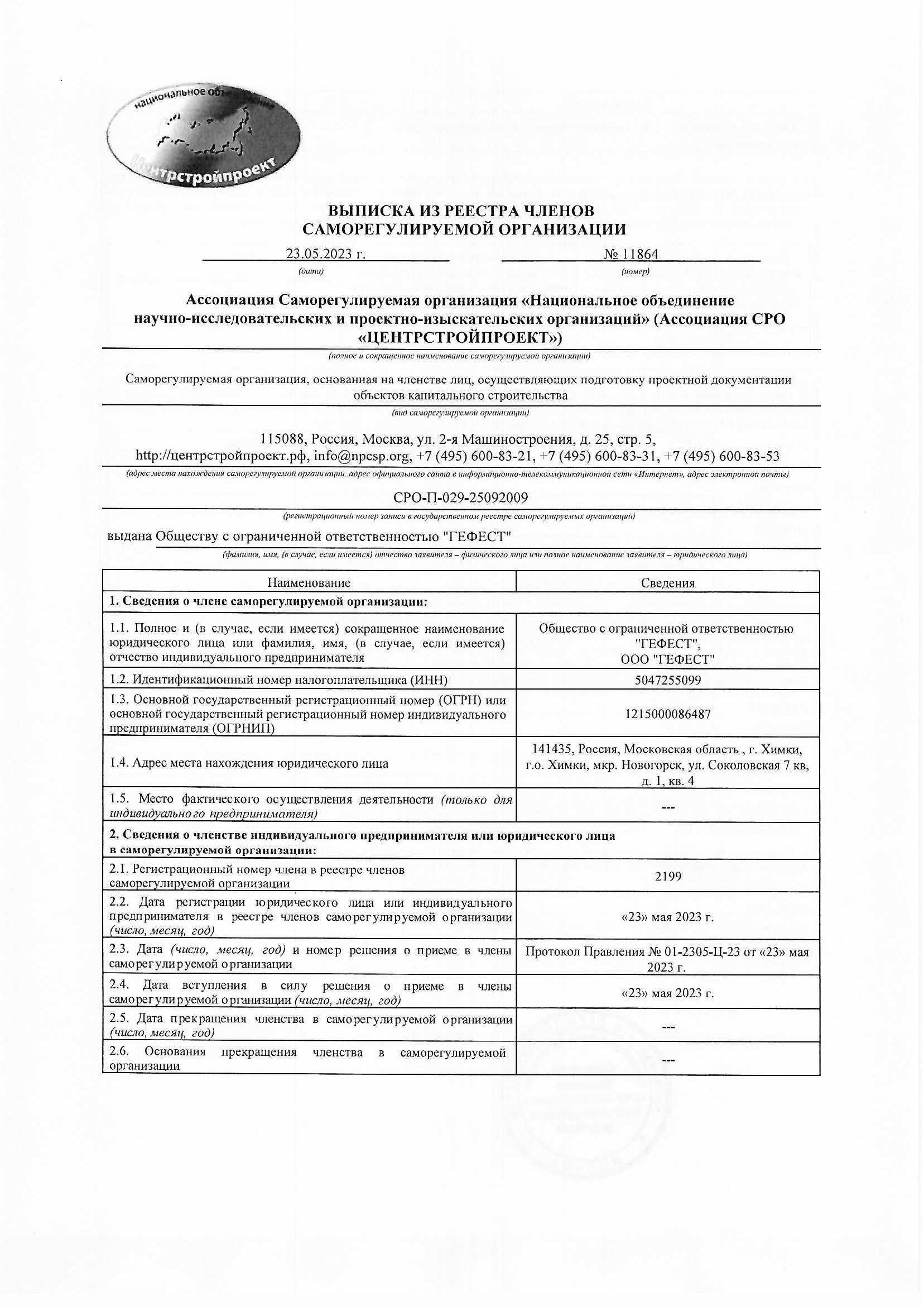 Регистрационный номер члена СРО ЦЕНТРСТРОЙПРОЕКТ: